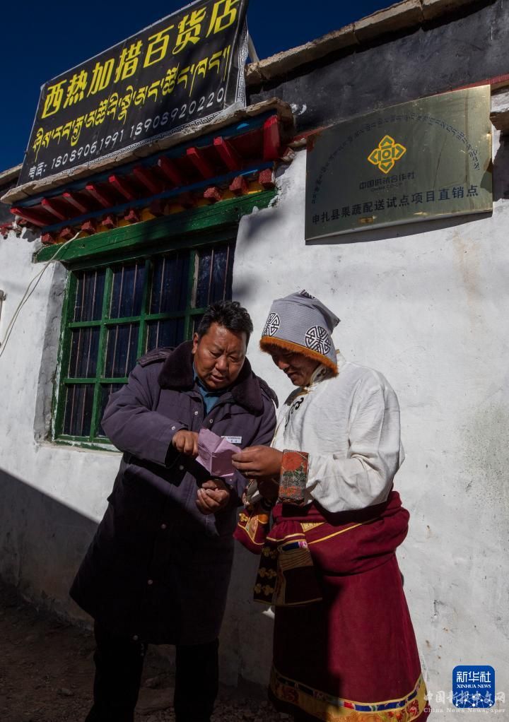 申扎縣供銷合作社的配送負(fù)責(zé)人吳瓦(左)與馬躍鄉(xiāng)貝嘎四村偏遠(yuǎn)鄉(xiāng)鎮(zhèn)果蔬配送試點項目直銷點店主西熱加措核對配送清單(1月5日攝)。
