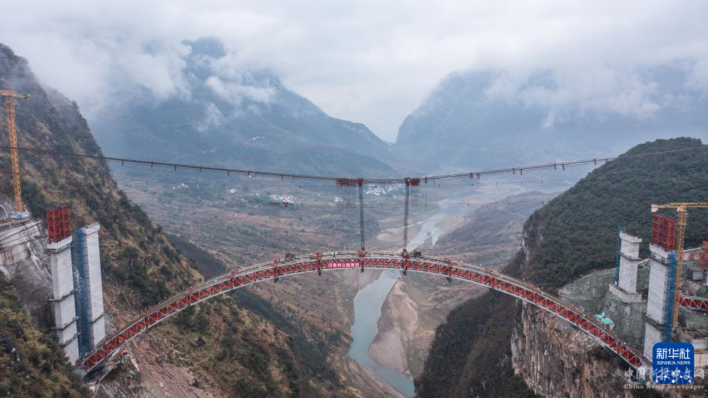 納晴高速烏蒙山大橋主拱圈右幅順利合龍(1月11日攝,無人機照片)。