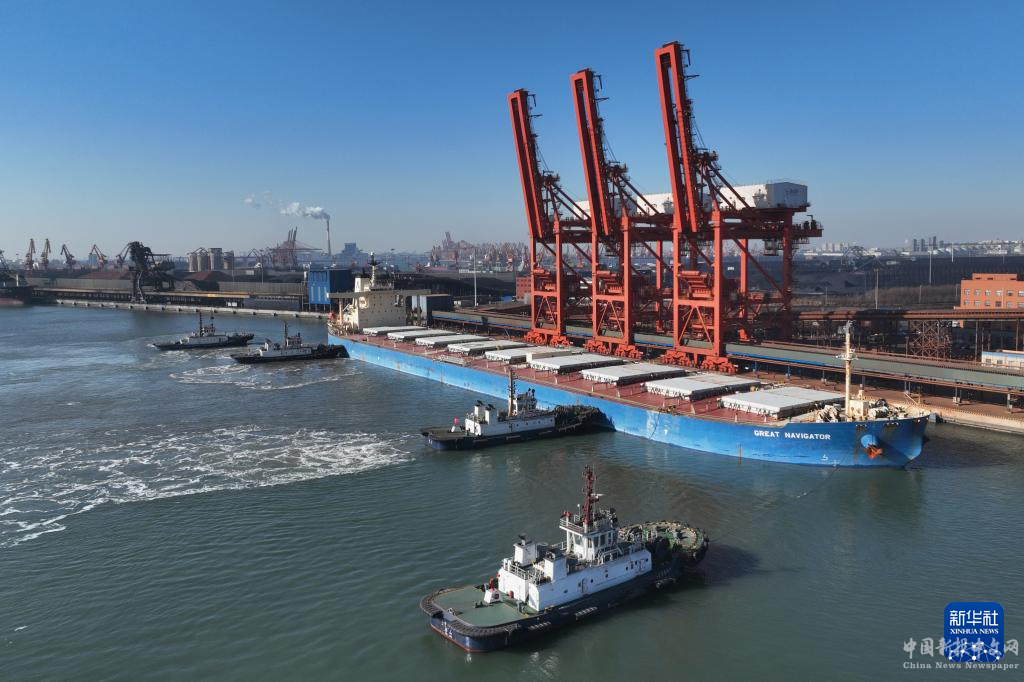 1月15日,一艘輪船在拖輪的協(xié)助下向唐山港京唐港區(qū)煤炭碼頭靠泊(無人機(jī)照片)。