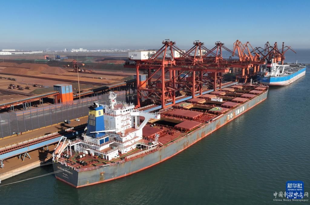 1月15日,兩艘輪船靠泊在唐山港京唐港區(qū)礦石碼頭卸載貨物(無人機(jī)照片)。
