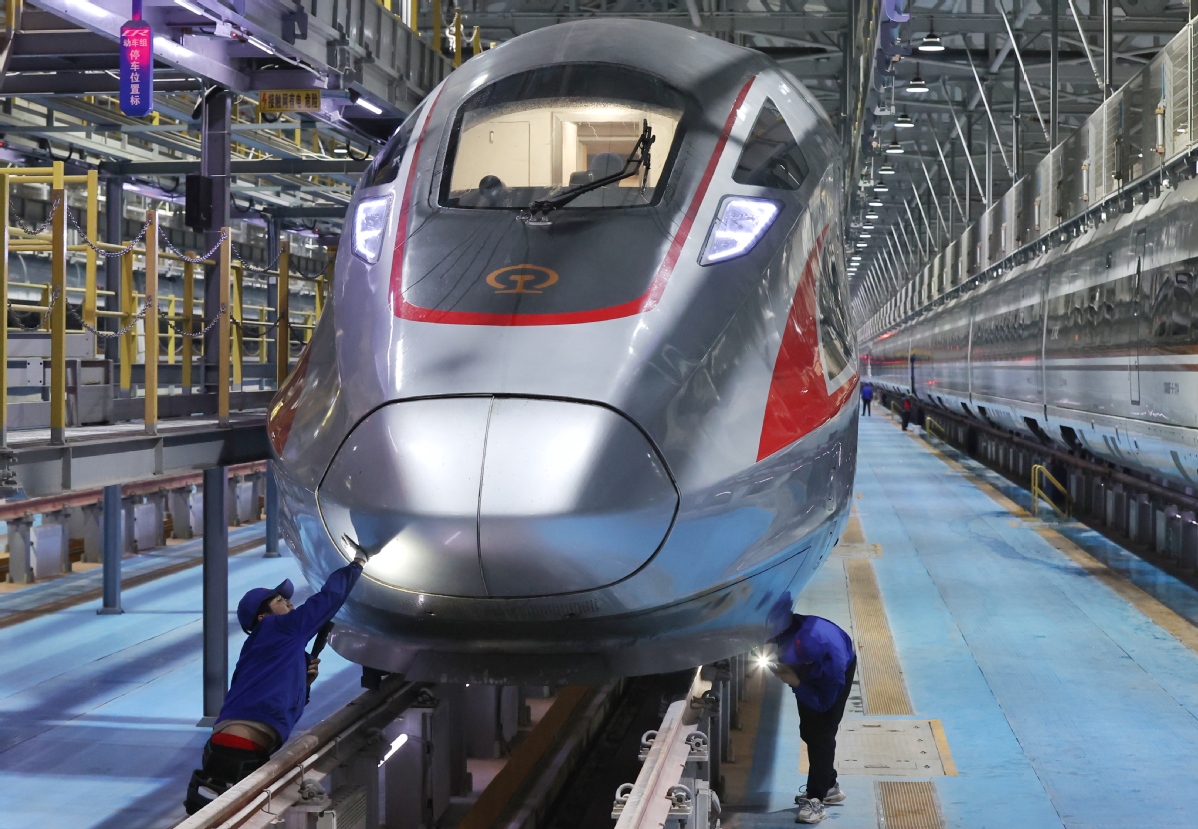 中國(guó)日?qǐng)?bào)北京1月25日電(記者 姜東)2024年1月25日晚,春運(yùn)前夕,在北京動(dòng)車段朝陽(yáng)動(dòng)車運(yùn)用所,檢修人員對(duì)即將參與2024年春運(yùn)的動(dòng)車組列車進(jìn)行全方面檢查,確保春運(yùn)安全。