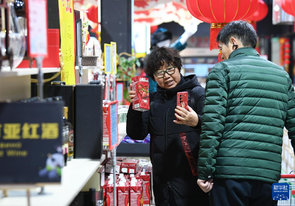 2月1日,消費(fèi)者在“中歐班列(西安)進(jìn)口商品年貨節(jié)”上挑選來自中亞的果汁。