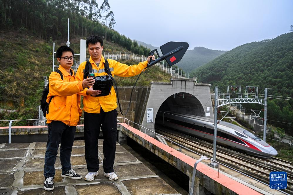 2月1日,“捕風者”何潤翔(右)、覃國勇在高鐵線附近尋找信號干擾源。