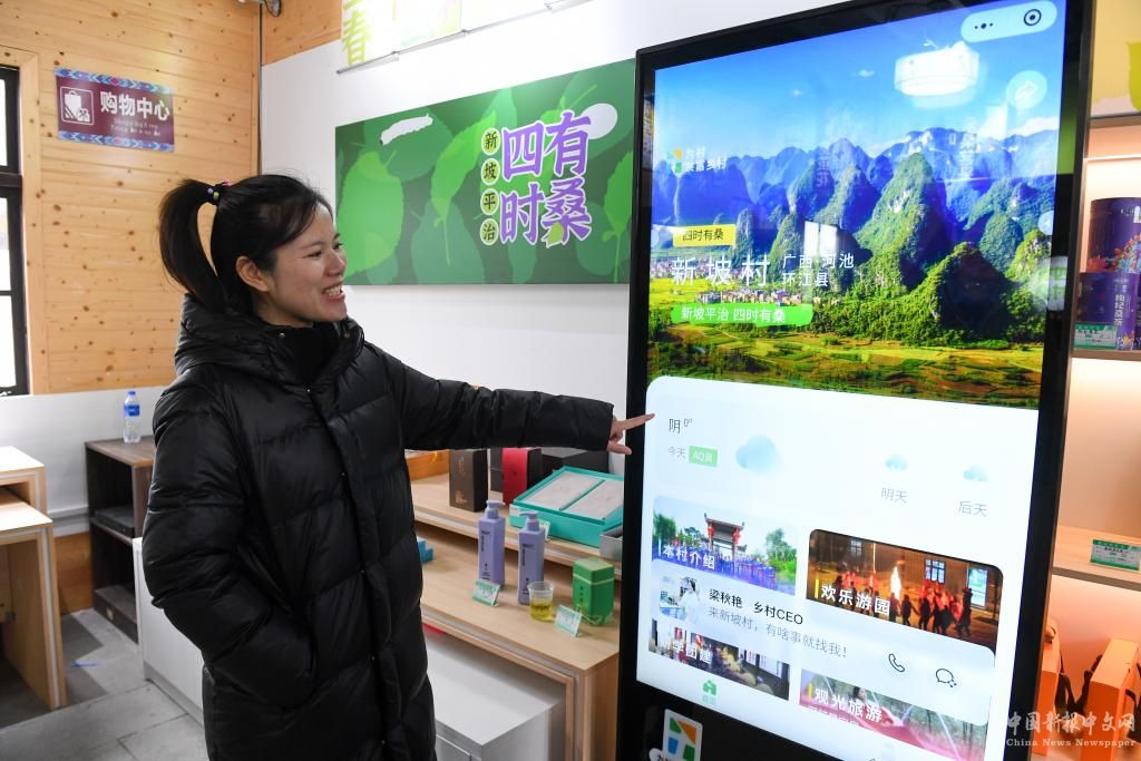 1月26日,在廣西河池市環(huán)江毛南族自治縣大才鄉(xiāng)新坡村的游客中心,“鄉(xiāng)村CEO”梁秋艷介紹粵桂數(shù)字農(nóng)文旅平臺。新華社記者毛思倩 攝