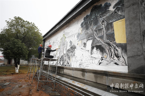 工人們正在為壁畫(huà)上色。