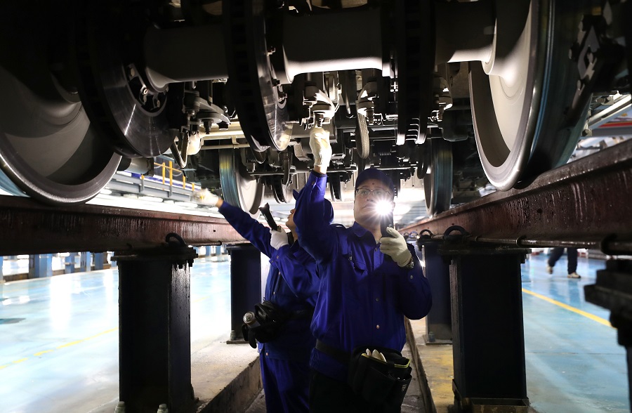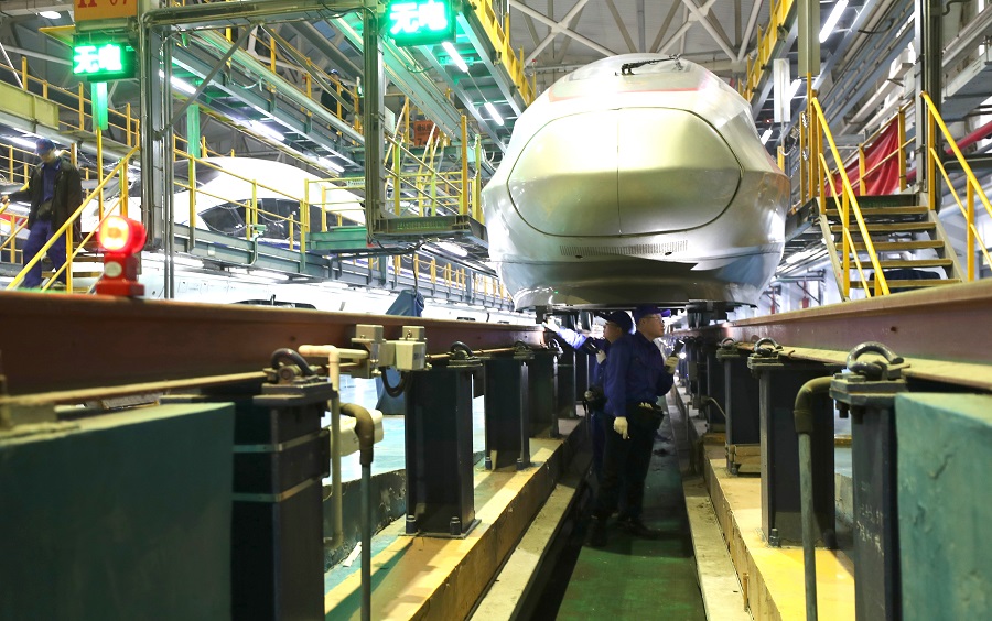 中國(guó)鐵路北京局北京動(dòng)車段北京南動(dòng)車所,工作人員檢修入庫(kù)動(dòng)車。中國(guó)日?qǐng)?bào)記者 鄒紅 攝