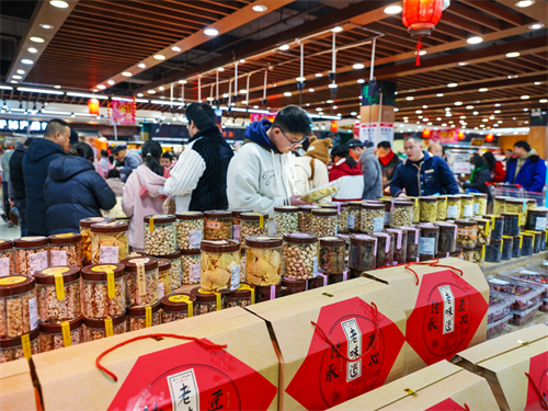 走進(jìn)臨湘市規(guī)模較大的購(gòu)物廣場(chǎng)“新富食村”,紅紅艷艷的新年裝飾、滿滿當(dāng)當(dāng)?shù)哪曦浬唐?、濃濃的?jié)日氛圍撲面而來(lái),琳瑯滿目的商品讓人目不暇接,各類干果、米面糧油熱銷產(chǎn)品應(yīng)有盡有,尤其是商務(wù)部等5部門剛公布的中華老字號(hào)“十三村”醬菜擺滿了貨架,吸引不少市民駐足挑選,收銀臺(tái)前更是排起長(zhǎng)隊(duì),呈現(xiàn)出一派購(gòu)銷兩旺的熱鬧場(chǎng)景,煙火味十足。