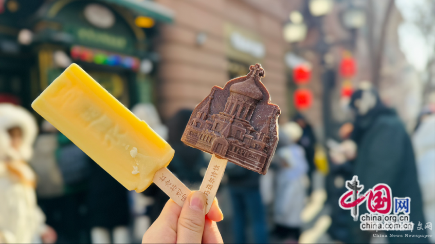 來(lái)到中央大街,必須要嘗嘗馬迭爾冰棍。以往馬迭爾冰棍只有兩種口味,今年增加四款新品,特別是文創(chuàng)類冰棍吸引大批游客拍照打卡。在寒風(fēng)中吃上一口馬迭爾冰棍,那叫一個(gè)“倍兒爽”。