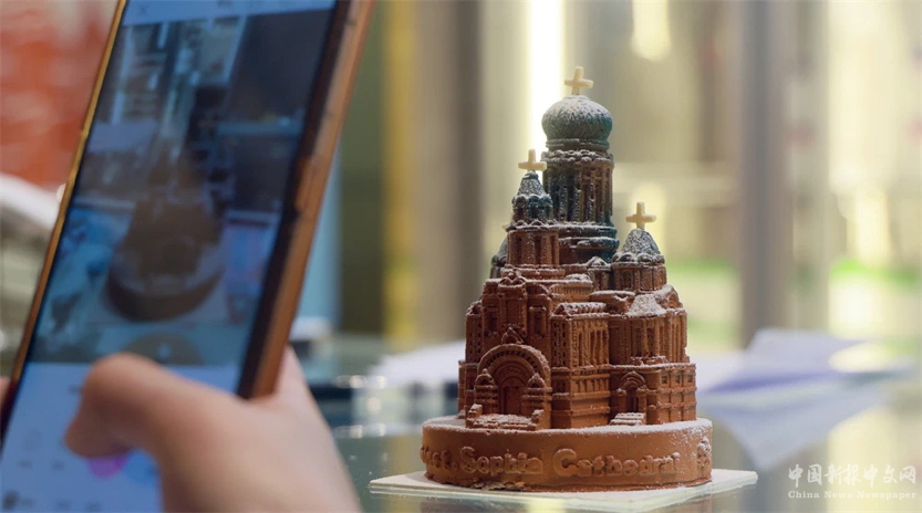 “爾濱”文創(chuàng)的另一個(gè)“爆款”,則是一款外形與索菲亞教堂一樣的慕斯蛋糕。由于這款蛋糕制作流程復(fù)雜,一天只能生產(chǎn)百余個(gè),據(jù)店主郭金鵬介紹,每天都會(huì)有顧客提前一兩個(gè)小時(shí)前來(lái)排隊(duì)??吹接慰蛡儗?duì)這款蛋糕如此厚愛,郭金鵬曾熱淚盈眶:“不是因?yàn)樽约涸O(shè)計(jì)的蛋糕火了,而是哈爾濱冰雪魅力被大家所認(rèn)可,很感動(dòng)。”