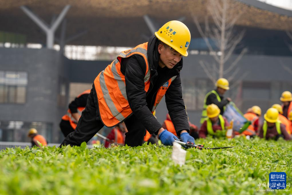 3月8日,施工人員對(duì)場(chǎng)館外綠化帶進(jìn)行栽種和修剪。