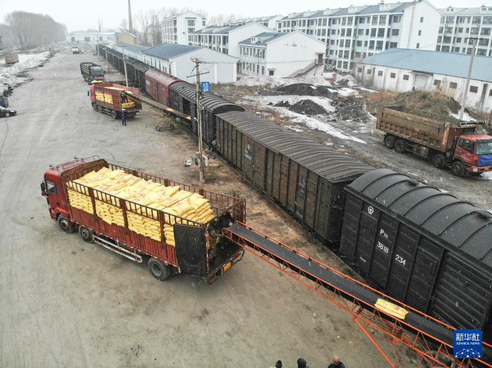 3月14日,在黑龍江北大荒農(nóng)業(yè)股份有限公司友誼分公司農(nóng)資鐵路專運線,工人在卸運化肥(無人機照片)。