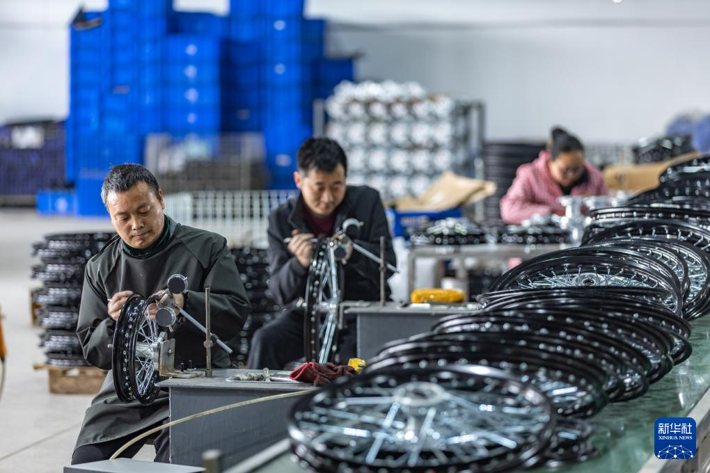 3月15日,在位于重慶市璧山區(qū)的重慶悍威新能源有限公司,工作人員在組裝車(chē)間的生產(chǎn)線上組裝輪轂。該公司生產(chǎn)的摩托車(chē)經(jīng)檢測(cè)合格后,將通過(guò)中歐班列發(fā)往歐洲。