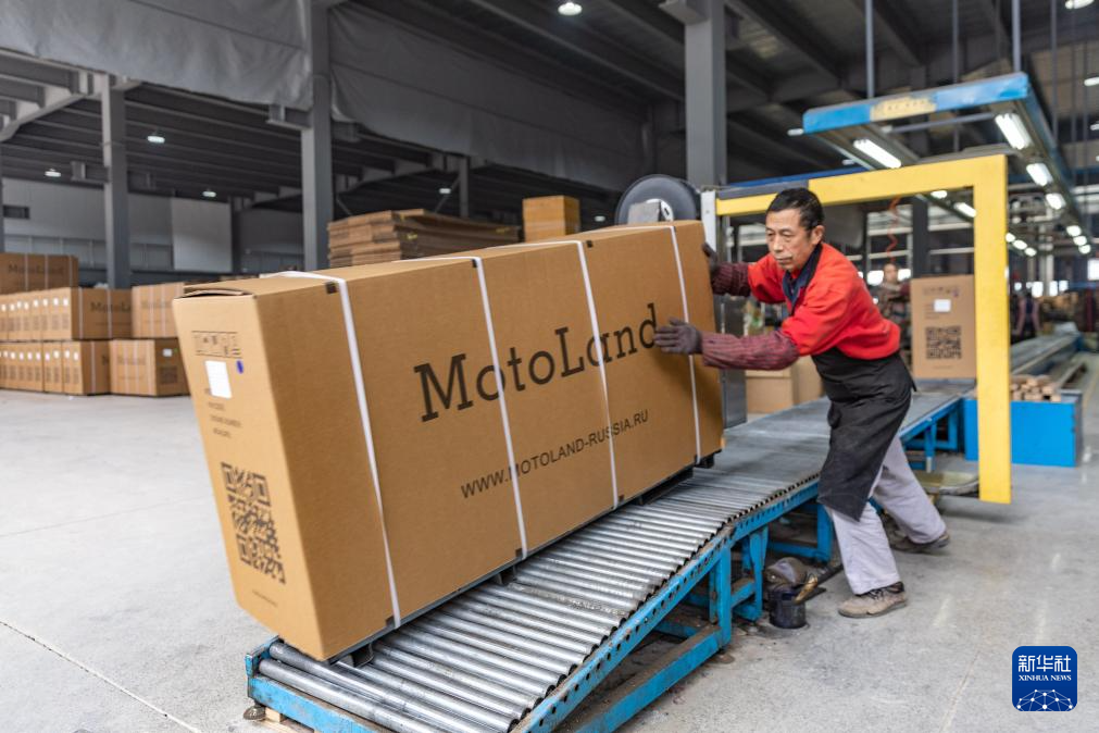3月15日,在位于重慶市璧山區(qū)的重慶悍威新能源有限公司,工作人員將打包好的摩托車(chē)推下打包線,該貨物將通過(guò)中歐班列發(fā)往歐洲。