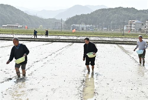 3月19日,陽光明媚,湖南省隆回縣羊古坳鎮(zhèn)雷峰村超級雜交水稻高產(chǎn)攻關(guān)科研基地一片忙碌景象,工作人員正在抓住晴好天氣在田間勞作,有的在分廂、平廂,有的在播種再生稻,用扎帚壓扎谷粒。