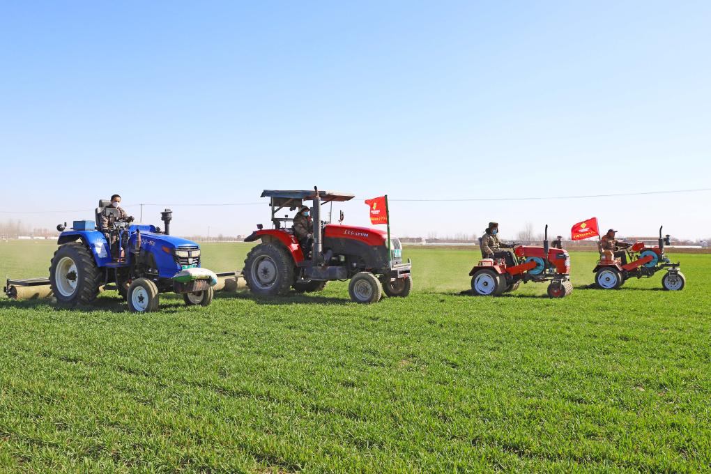 河北省涿州市某農(nóng)機(jī)服務(wù)專業(yè)合作社的成員駕駛自走式麥田鎮(zhèn)壓機(jī)進(jìn)行田間管護(hù)。(受訪單位供圖)