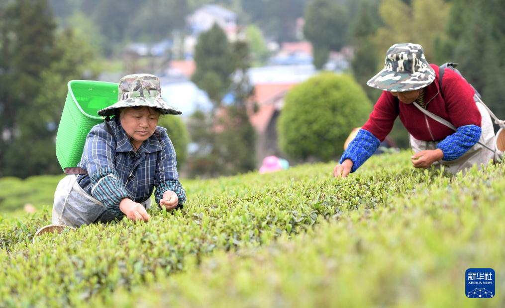 4月5日,村民在貴州省遵義市余慶縣松煙鎮(zhèn)二龍村茶場采摘春茶。