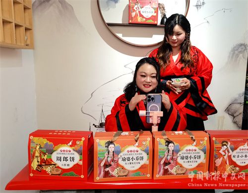 2024年4月8日,在安徽省合肥市廬江縣一家電商企業(yè),電商達人正在直播帶貨以三國周瑜、小喬為文化背景的本土特色產(chǎn)品“周郎餅”“瑜婆小喬餅”。