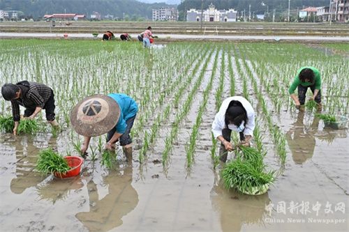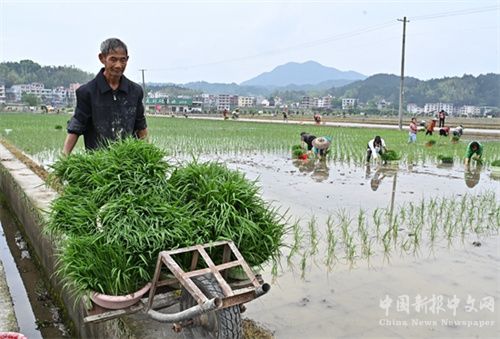 4月23日,湖南省隆回縣羊古坳鎮(zhèn)雷峰村超級(jí)雜交水稻高產(chǎn)攻關(guān)科研基地再生稻示范田里,農(nóng)機(jī)手正在旋耕整田,老農(nóng)夫吆喝著黃牛,三十多名插秧高手按打格劃行株距有序移栽,構(gòu)成了一幅美麗的春耕圖畫(huà)。
