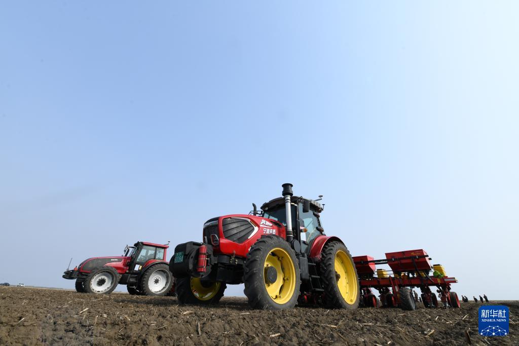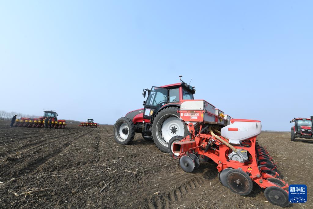 4月25日,在黑龍江北大荒農(nóng)業(yè)股份有限公司友誼分公司第五管理區(qū)一地塊,大馬力農(nóng)業(yè)機械進行玉米播種作業(yè)。