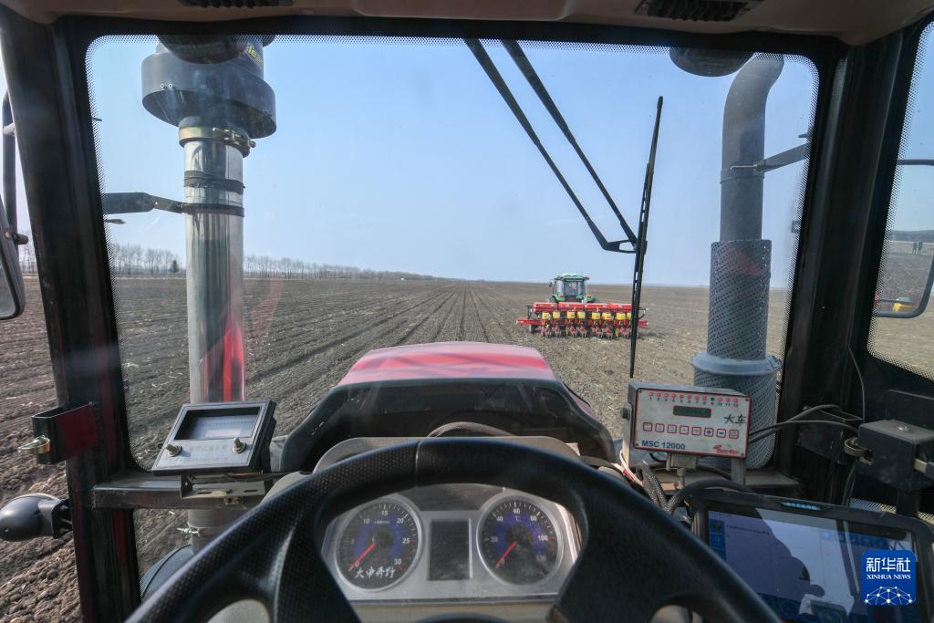 4月25日,在黑龍江北大荒農(nóng)業(yè)股份有限公司友誼分公司第五管理區(qū)一地塊,一名農(nóng)機手駕駛大馬力農(nóng)業(yè)機械進行玉米播種作業(yè)。