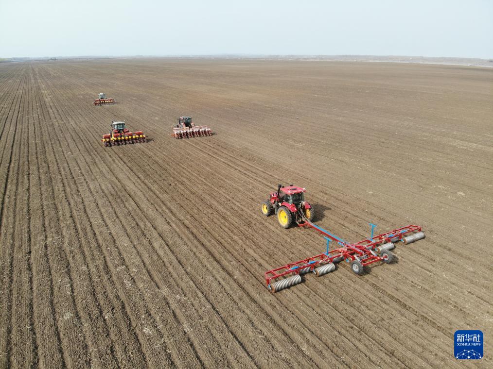 4月25日,在黑龍江北大荒農(nóng)業(yè)股份有限公司友誼分公司第五管理區(qū)一地塊,大馬力農(nóng)業(yè)機械進行玉米播種作業(yè)(無人機照片)。