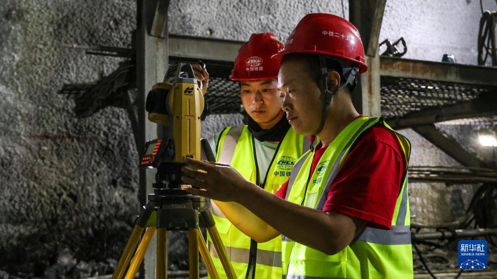 5月14日,六綿山隧道爆破貫通后,技術(shù)人員在對隧道的爆破作業(yè)面進行測量。