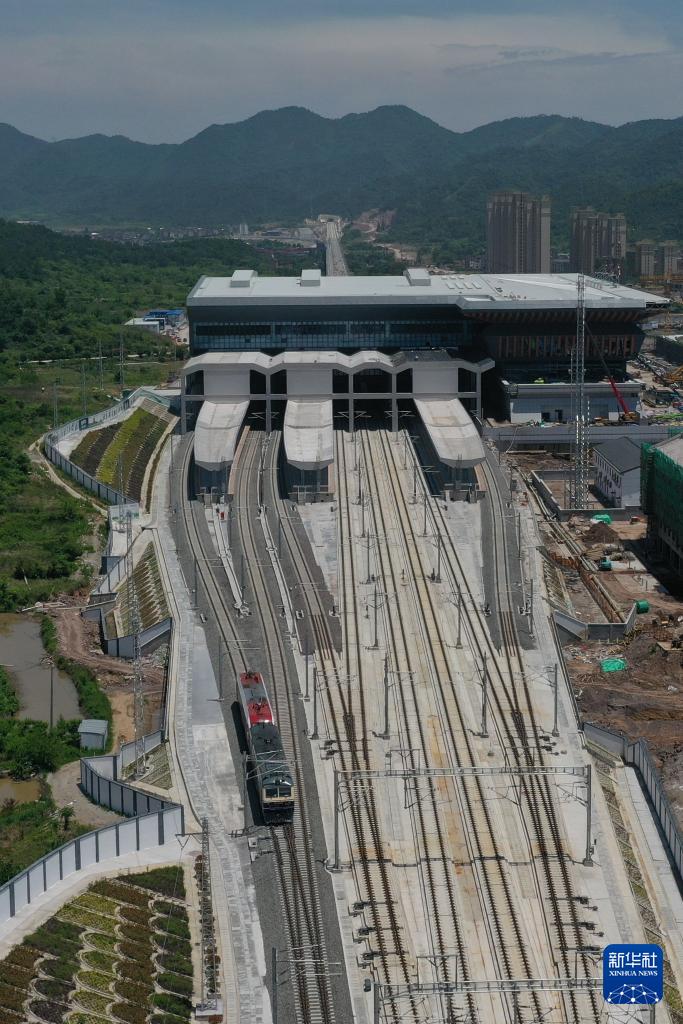 5月14日,首趟熱滑試驗(yàn)列車(chē)駛?cè)牒紲馗哞F橫店站(無(wú)人機(jī)照片)。
