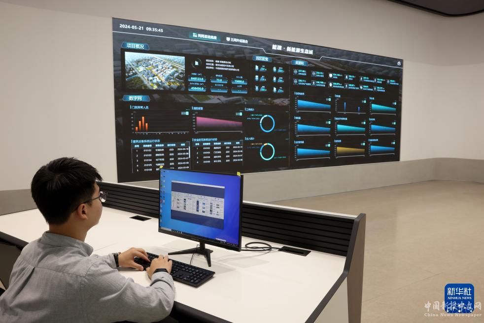 5月21日,技術(shù)人員在雄安新區(qū)雄安站樞紐片區(qū)的中國能建“能建·新能源生態(tài)城”項目展示區(qū)智慧運營中心工作。