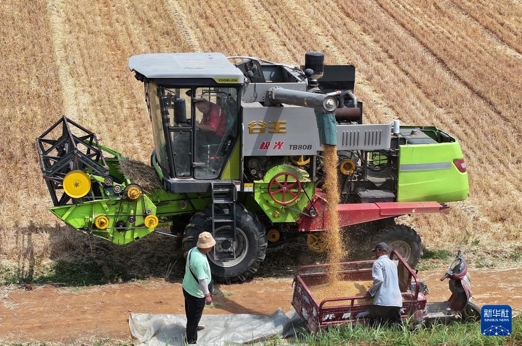 5月22日,農(nóng)民駕駛收割機在河南省寶豐縣李莊鄉(xiāng)祁家村麥田里收割小麥。