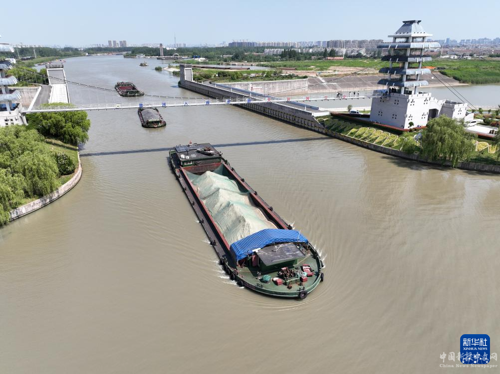 初夏時(shí)節(jié),江蘇省淮安市水上立交京杭大運(yùn)河水道運(yùn)輸煤炭、建材等物資的船只往來穿梭,一派忙碌。