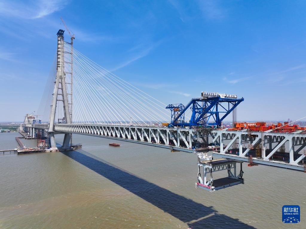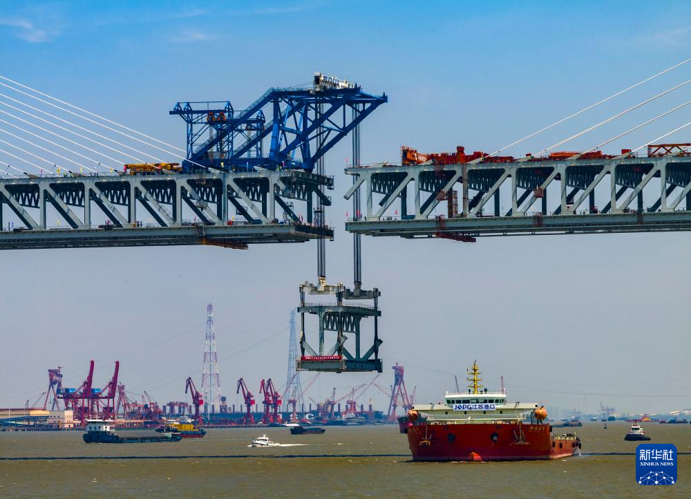 5月29日拍攝的常泰長江大橋主航道橋合龍段鋼桁梁吊裝現(xiàn)場。
