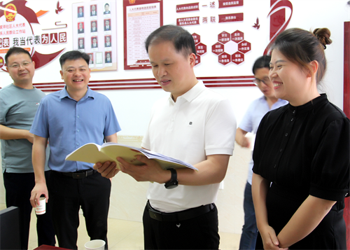 看畢,馮杰又來到人大工作室。當(dāng)他翻開桌上一本本的工作和會議記錄時(shí),看著,看著,臉上情不自禁地綻開了欣喜的微笑;在查看滿墻圖文并茂的布置時(shí),還拿出手機(jī)來拍照……