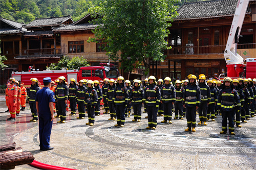 此次演練假設(shè)雷山縣郎德鎮(zhèn)郎德下寨村大區(qū)域民房著火,火災(zāi)迅速蔓延擴大引起村寨上方森林火災(zāi),形成寨火山火同時猛烈燃燒災(zāi)情。鑒于郞德鎮(zhèn)屬于50戶以上木質(zhì)連片結(jié)構(gòu)村寨,一旦發(fā)生火情會迅速擴大蔓延,演練總指揮部采取突擊調(diào)派,實戰(zhàn)實訓(xùn)的形式,設(shè)置了鳴鑼喊寨、村寨自救、初戰(zhàn)控火、供水保障、內(nèi)攻救人、屬地調(diào)派、跨區(qū)域增援、?;钒徇\、多部門協(xié)同聯(lián)動等9個實戰(zhàn)科目,先后調(diào)集黔東南、黔南、銅仁三個消防救援支隊和國家消防救援局貴州機動隊共22車、155名消防指戰(zhàn)員,以及公安、森防辦、供電、醫(yī)療、衛(wèi)健、通訊公司等8個部門聯(lián)動力量10車35人參與處置。