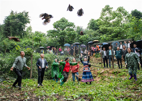 天柱縣聯(lián)山街道“轉(zhuǎn)水”養(yǎng)殖基地員工在喂雞。