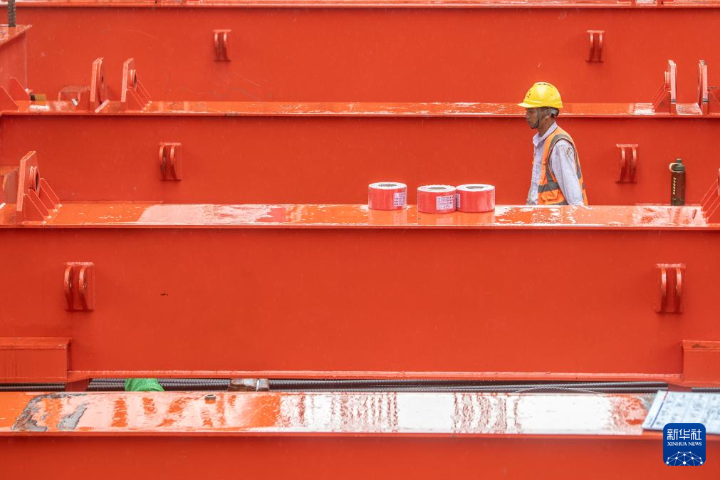 6月26日,渝萬高鐵新橋雙線特大橋建設(shè)現(xiàn)場,工人在架橋機(jī)上作業(yè)。