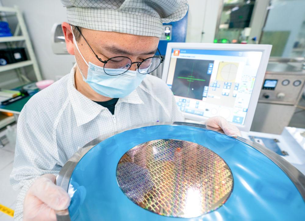 在位于湖北武漢的國家信息光電子創(chuàng)新中心,工作人員在無塵實驗室內(nèi)檢查晶圓(4月30日攝)。