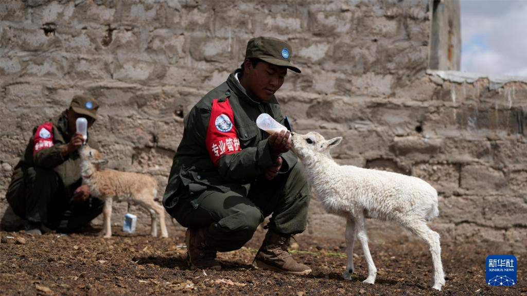 尼瑪縣措羅木管護(hù)站野保員在給白色藏羚羊幼崽喂奶(7月13日攝)。