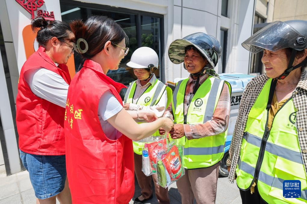 7月24日,道場鄉(xiāng)湖山府社區(qū)“小云朵”志愿者為戶外勞動者送上清涼禮包。
