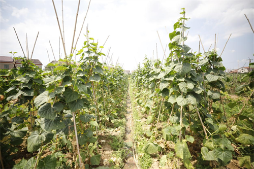 翠綠的黃瓜藤蔓上,一朵朵金黃色的小花競(jìng)相開放,結(jié)出的黃瓜長(zhǎng)勢(shì)喜人。