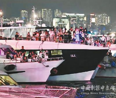 歌迷搭乘游艇在中環(huán)海濱觀看演唱會。 |