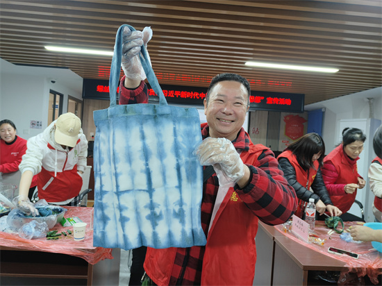 在手工扎染環(huán)節(jié),志愿者導(dǎo)師傳授扎染工藝的基礎(chǔ)知識(shí)、獨(dú)特魅力及實(shí)操技巧。志愿者們躍躍欲試,迫不及待地親手體驗(yàn)。在老師的指導(dǎo)下,志愿者們將手中的潔白布袋巧妙折疊、精心捆綁、細(xì)致染色、耐心清洗。不久,一個(gè)個(gè)扎染布袋在他們手中誕生,大家拿著自己親手做的扎染布袋,臉上洋溢著開(kāi)心的笑容,紛紛拍照留影,記錄下這美好的瞬間。