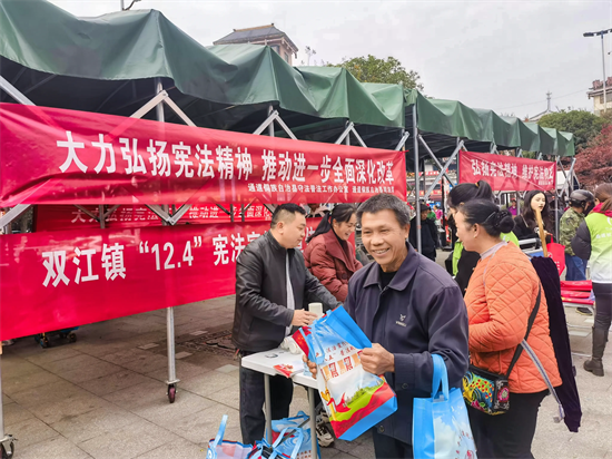 12月4日,國(guó)家第11個(gè)憲法日。湖南省通道縣雙江鎮(zhèn)人民一個(gè)不同尋常的趕集日,市場(chǎng)上多了一道亮麗的風(fēng)景線——由新時(shí)代文明實(shí)踐志愿服務(wù)隊(duì)伍聯(lián)合鎮(zhèn)司法所、派出所等部門設(shè)立的“憲法精神宣傳點(diǎn)”,為這場(chǎng)傳統(tǒng)的集市活動(dòng)增添了幾分法治的色彩。