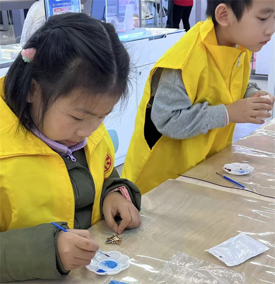 活動一開始,孩子們通過視頻學(xué)習(xí)了燒藍(lán)工藝的發(fā)源和制作流程,他們發(fā)出陣陣驚嘆:“燒藍(lán)首飾真漂亮啊”,“我已經(jīng)迫不急待的想擁有它們了”。在孩子們期盼的目光中,負(fù)責(zé)人分發(fā)了手工工具,有的選擇蝴蝶、有的選擇花朵、有的選擇千里江山……他們興奮的討論著,認(rèn)真的制作著。先調(diào)色,再上亮油,最后點涂,不一會兒,多姿多彩的燒藍(lán)胸針與發(fā)簪做好了,他們愛不釋手。有的孩子說要送給媽媽,有的孩子們說想自已留著用。