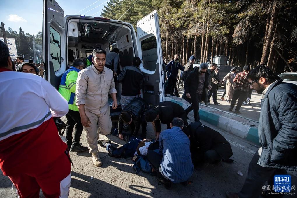 1月3日,在伊朗克爾曼市,醫(yī)護(hù)人員在爆炸事故現(xiàn)場附近搶救傷員。新華社/美聯(lián)