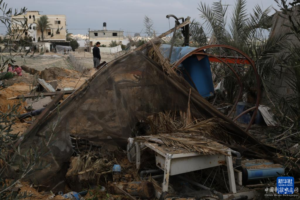 2月18日,在加沙地帶南部城市拉法,巴勒斯坦人查看以軍空襲后的損毀情況。新華社發(fā)(哈立德·奧馬爾攝)