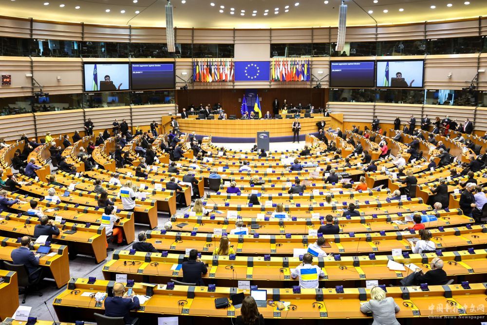2022年3月1日,在比利時布魯塞爾舉行的歐洲議會全會上,烏克蘭總統(tǒng)澤連斯基遠(yuǎn)程發(fā)表演講。新華社發(fā)(歐盟供圖)