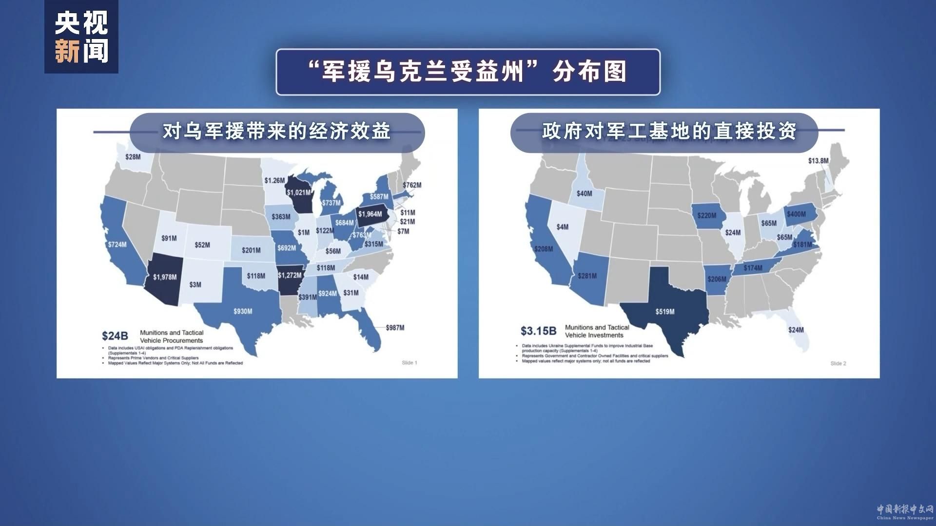 去年11月,美國政府還向國會議員散發(fā)了一份“軍援烏克蘭受益州”分布圖,首次詳細列出大約270億美元對烏軍援如何轉(zhuǎn)化為對數(shù)十個州的軍工業(yè)投資。分布圖主要分為兩部分,分別是“對烏軍援帶來的經(jīng)濟效益”和“政府對軍工基地的直接投資”。