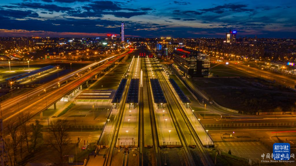 這是2024年3月17日傍晚拍攝的夜色中的匈塞鐵路塞爾維亞境內(nèi)貝諾段新貝爾格萊德站(無(wú)人機(jī)照片)。