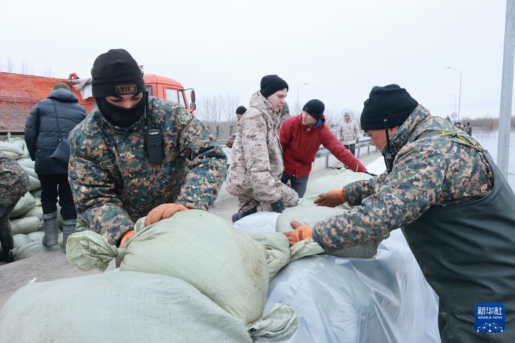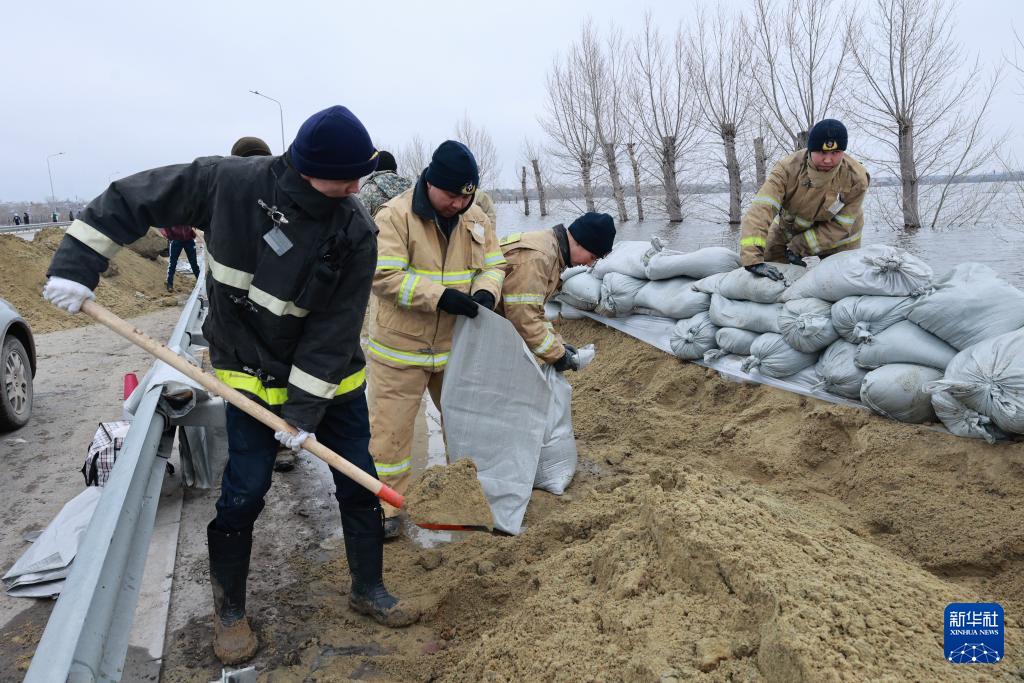4月7日,在哈薩克斯坦科斯塔奈州,安全人員布設(shè)防洪堤壩。