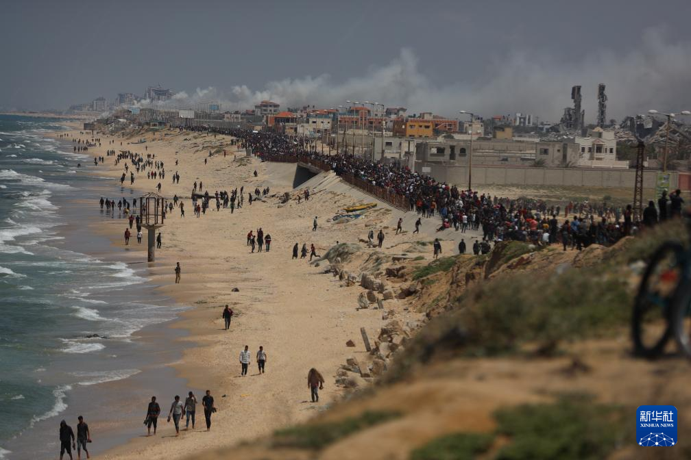 這是4月14日在加沙地帶拉希德路中部路段拍攝的向北返家的人群。